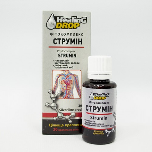 СТРУМИН - растительный фитокомплекс, в состав которого входят алкалоиды, флавоноиды, сапонины, витамины и микроэлементы (кальций, натрий, калий, селен). Струмин оказывает противовоспалительное, спазмолитическое, противоаллергическое, седативное действие, способствует восстановлению обмена веществ в органах и тканях, нормализации сердечного ритма и улучшению работы сердца, устраняет симптомы гипертиреоза.